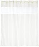 Ez On shower curtain does not require the use of shower curtain hooks. Product is water resistant, so a separate shower liner is not needed as well. Constructed of 100-percent Polyester, size 70-inch wide by 72-inch long.